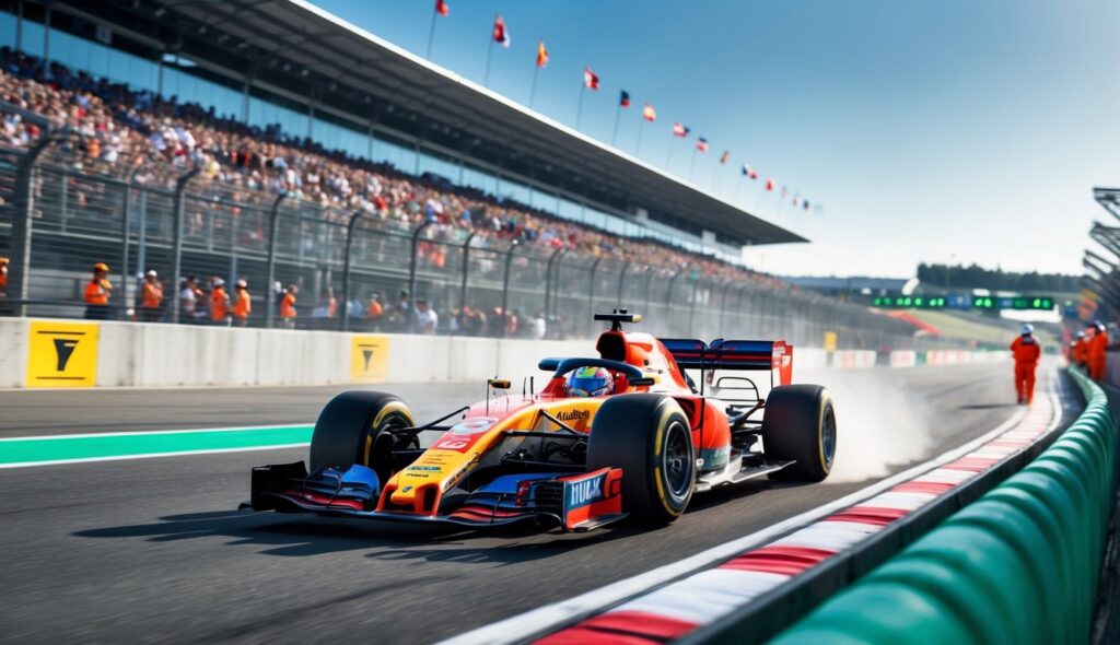 Mobil balap Formula 1 melaju cepat di lintasan sirkuit dengan penonton di tribun yang bersorak.